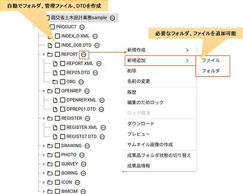 電子成果物を追加すると、「土木設計業務等の電子納品要領」に準拠したフォルダ構成、管理ファイル(XML)、DTDファイルを自動で作成します。