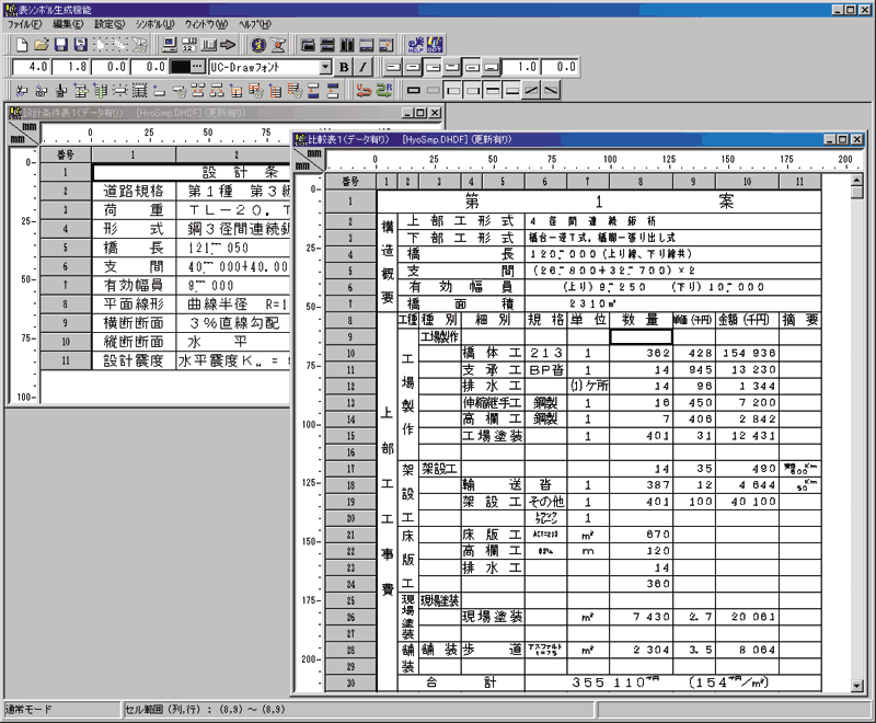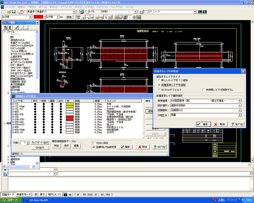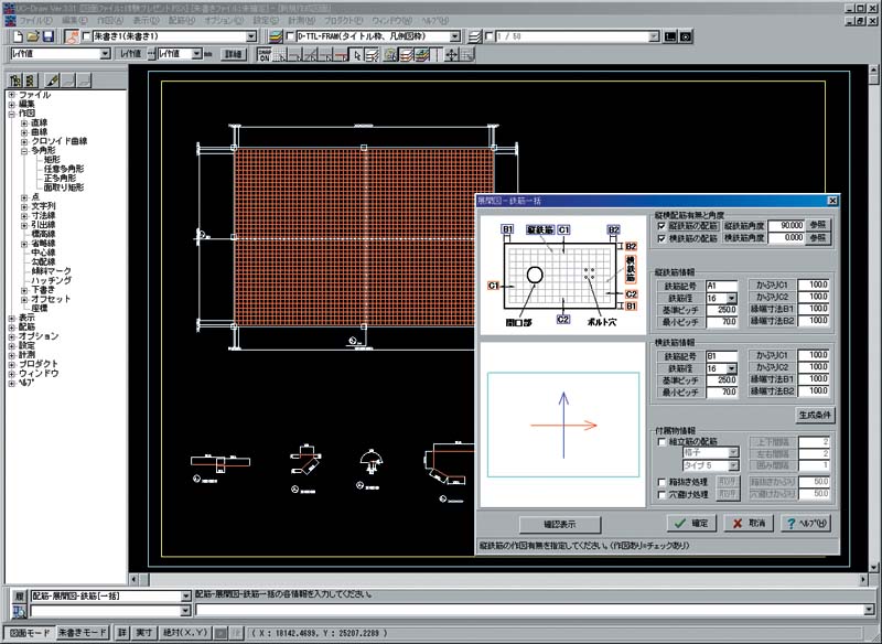 汎用CAD機能に加え、土木専用CADとして、計算機能のある鉄筋表生成機能、ワークシートによる作表機能、ラスターベクタ混在編集が可能なラスター機能、シンボル集、帯表/柱状図作成機能、線形変換機能、任意形RC構造物配筋図など土木汎用CADとして、強力に威力を発揮します。配筋図製品、UC-1設計シリーズと連携し、土木製図をトータルにサポートします。