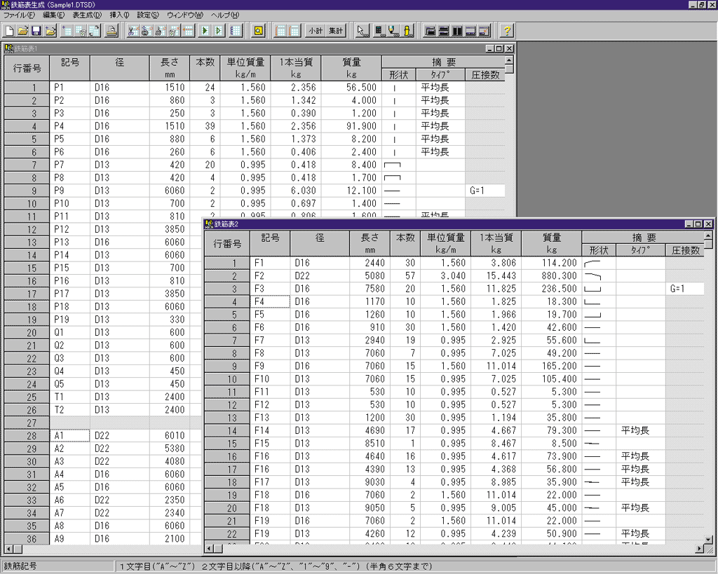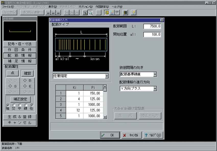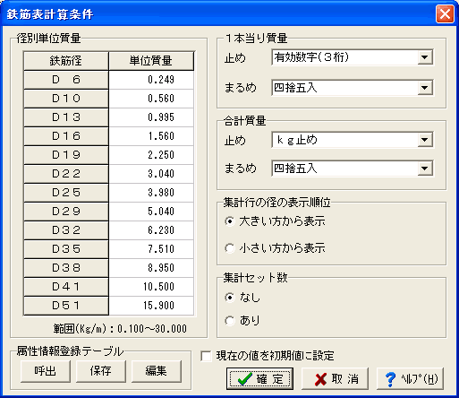 重量値のまるめ・止め方法などの計算条件、鉄筋表のサイズ・文字サイズ・文字位置などの作図書式の細かな設定が行えます。横計算・小計・集計計算機能も装備しています。