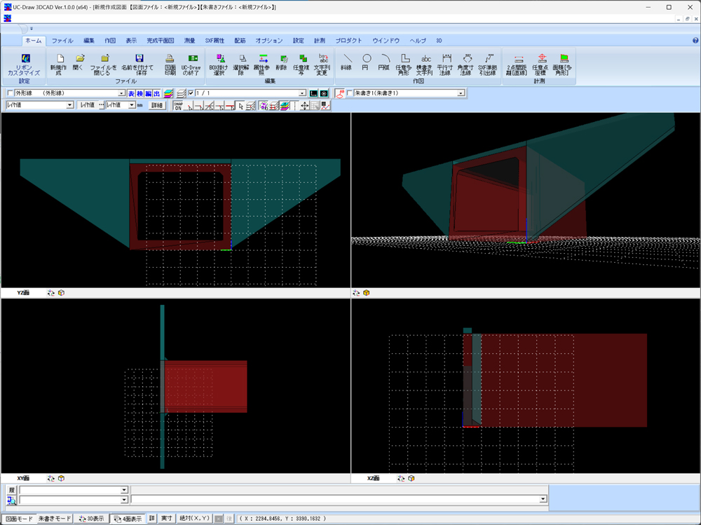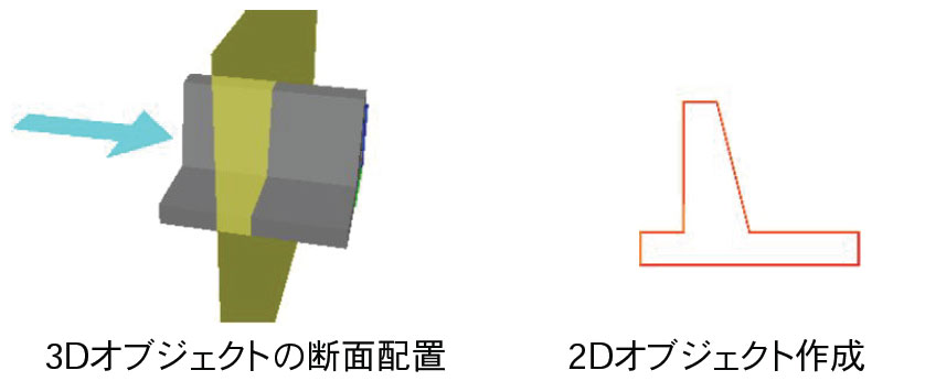 3Dオブジェクトから「断面図」「外形図」を作成することができます。「断面図」では「断面の位置」と「視線方向」、「外形図」では「視線方向」を指定することで、2Dの図形を作成することができます。