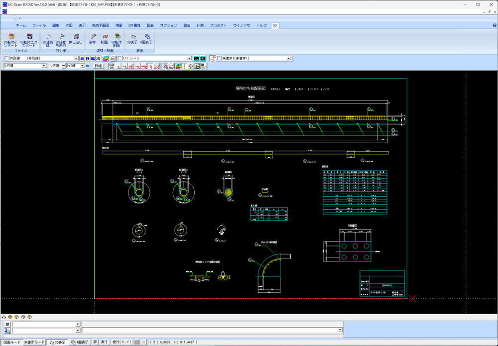 「UC-Draw・3DCAD」は、汎用の作図・編集機能に加え、土木作図コマンドや土木図形生成機能、朱書き機能、3D機能を備える「土木専用の2次元・3次元汎用CAD」製品であり、構造一般図や配筋図を始めとする様々な土木図面を効率よく作成する環境を提供します。