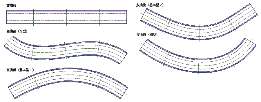 線形変換機能では、マウスを主体とした簡単な操作により、シンボル生成機能で作成した「線形シンボル」と「変換したいシンボル」を選択し、変換のための属性を設定するだけで非常に効率的に変換処理を行うことができます。また、約10種類(2種類の基本変換法×5種類の属性+無変換+非表示)の変換方法を組み合せて使用する事により、さまざまな変換処理を施したシンボルが作成できます。平面線形に加わえ、縦断線形変換が行えます。