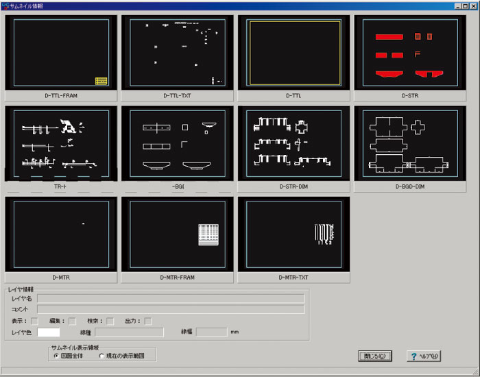 SXF Ver2.0仕様(幾何図形)の入出力に加え、SXF Ver3.1仕様(幾何図形+図面管理情報+Area_controlハッチング+属性情報)の入出力機能に対応しています。そのため、幾何図形に加え、Ver3.0仕様で追加された図面管理情報(表題欄情報)や背景色、図形に付加された属性情報の確認・変更・追加が的確に行えます。