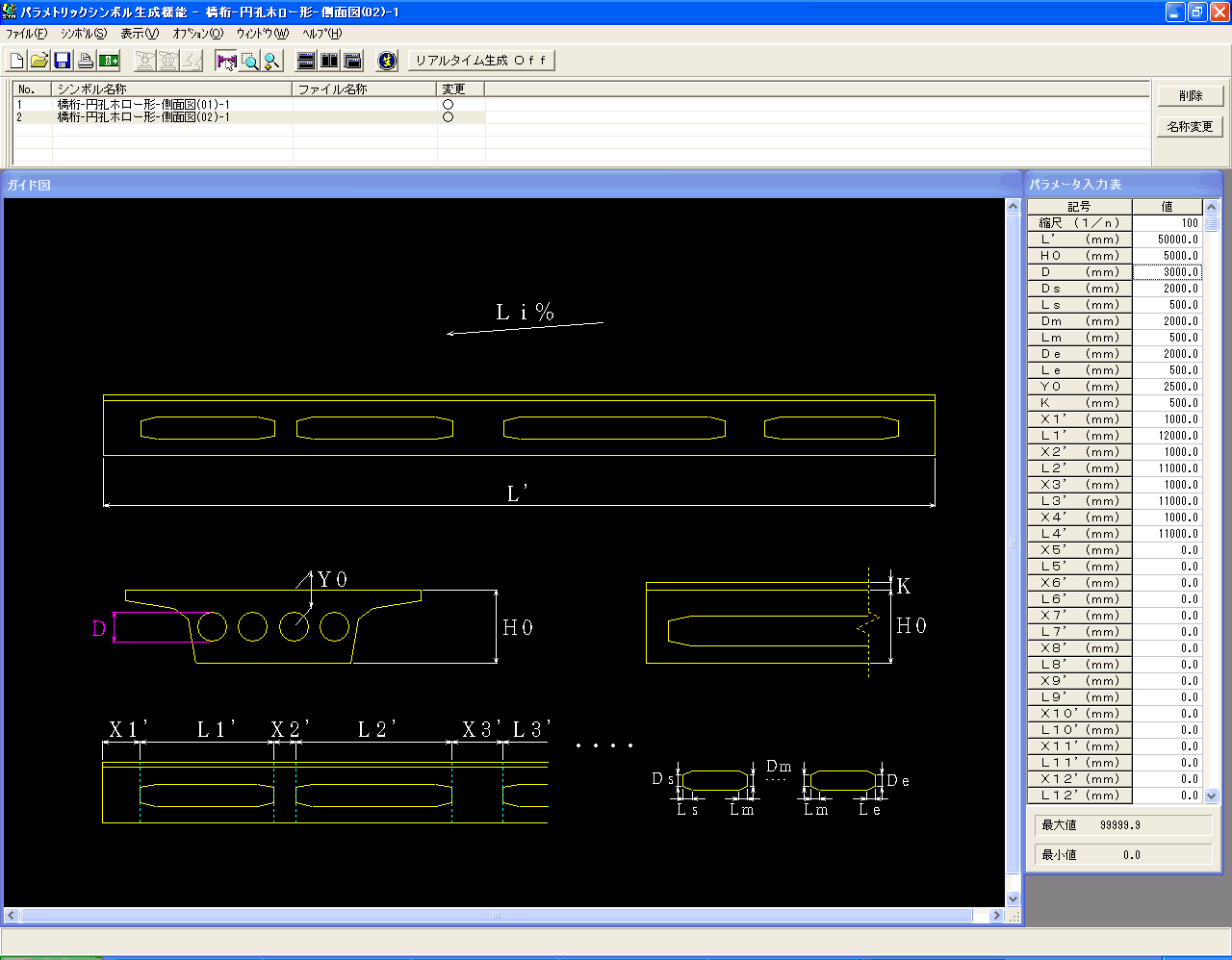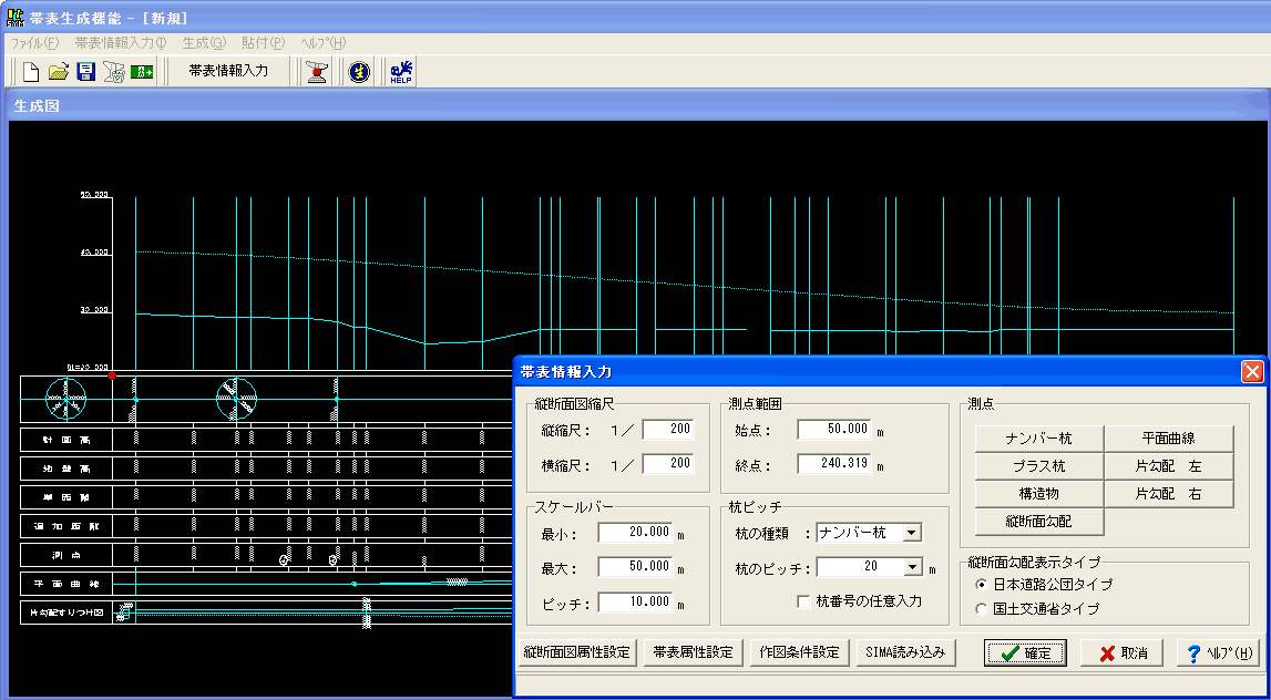 杭ピッチや測点などの基本データの入力により、橋梁一般図で使用される帯表を簡単に生成することができます。また、計画高など内部的に計算できる部分については、できるだけ内部生成を行っています。その他、縦断面図の作成を補助する目的として、計画線・地盤線などの補助線もあわせて生成します。作図項目の並べ替え等編集も可能です。また、SIMAデータ(縦断)の読込みにも対応しています。