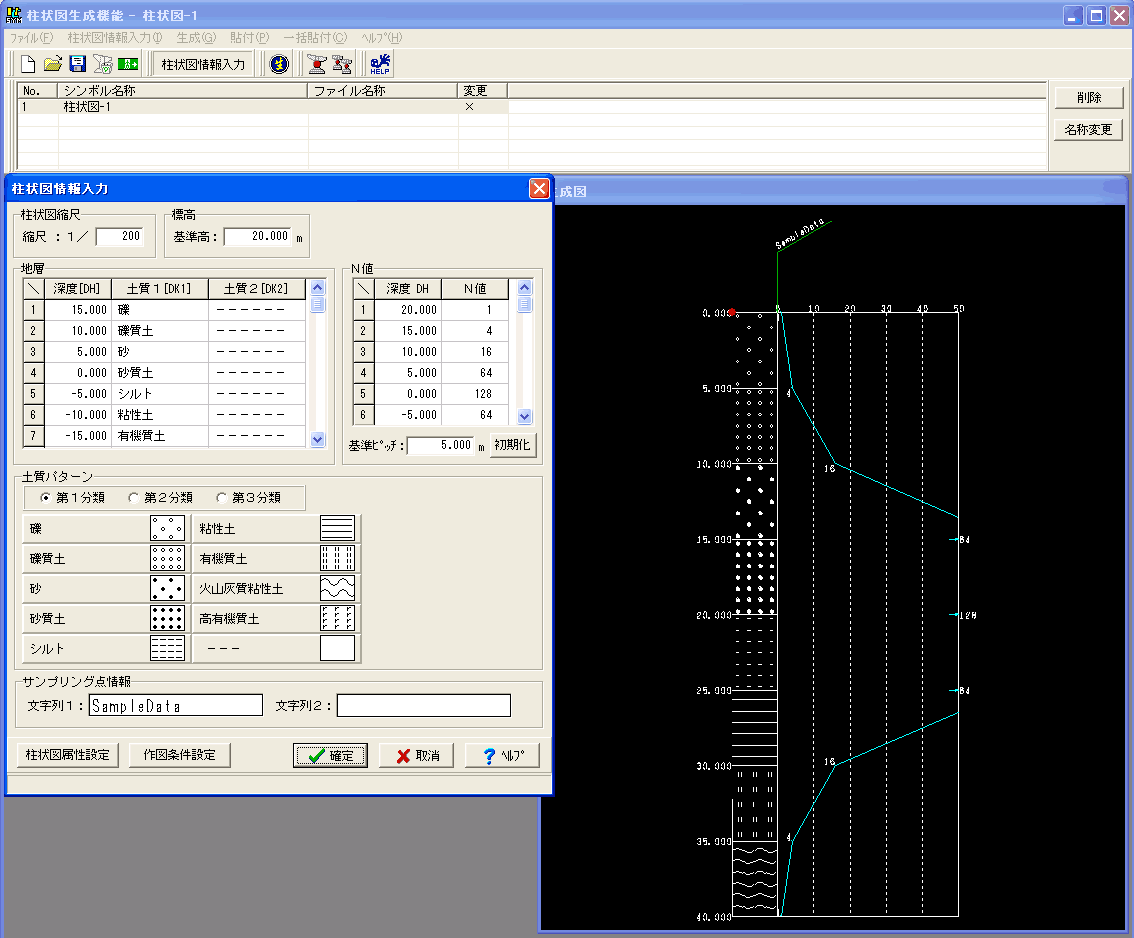 N値や土質とその深度などの入力により、柱状図を簡単に生成することができます。また、土質パターンは、第1分類9種類、第2分類13種類、第3分類14種類をサポートしています。土質の組み合わせ表示や深度、N値、サンプリング点の表示が可能です。