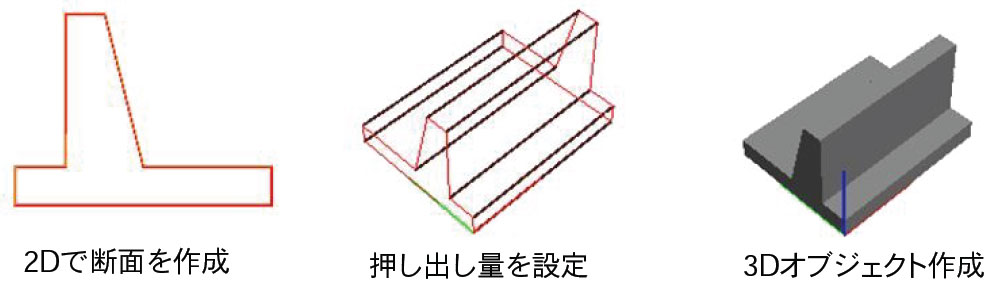 3Dオブジェクトは「押し出し」「スイープ」等で作成することができます。その場合に使用する「断面」を2Dオブジェクトで作成、または既存の図形から選択後に、「押し出し量」「パス」を指定することで容易に3Dオブジェクトを作成することができます。