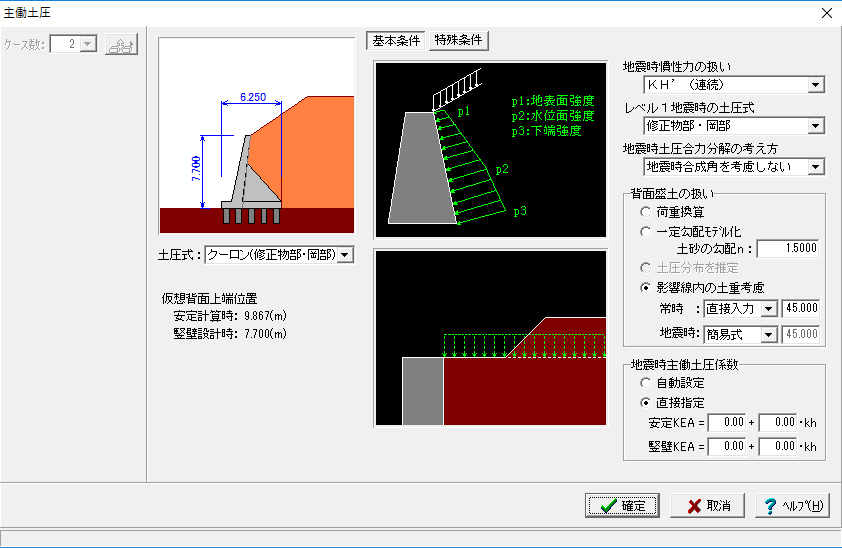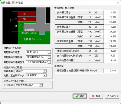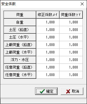ケース毎に安全性の照査(終局限界照査)、使用性の照査(使用限界照査)のいずれかを選択可能です。また、各照査毎に剛体安定照査、断面破壊の照査の有無を設定できます。荷重係数や修正係数等の安全係数を各荷重毎に設定することもできるようにしています。