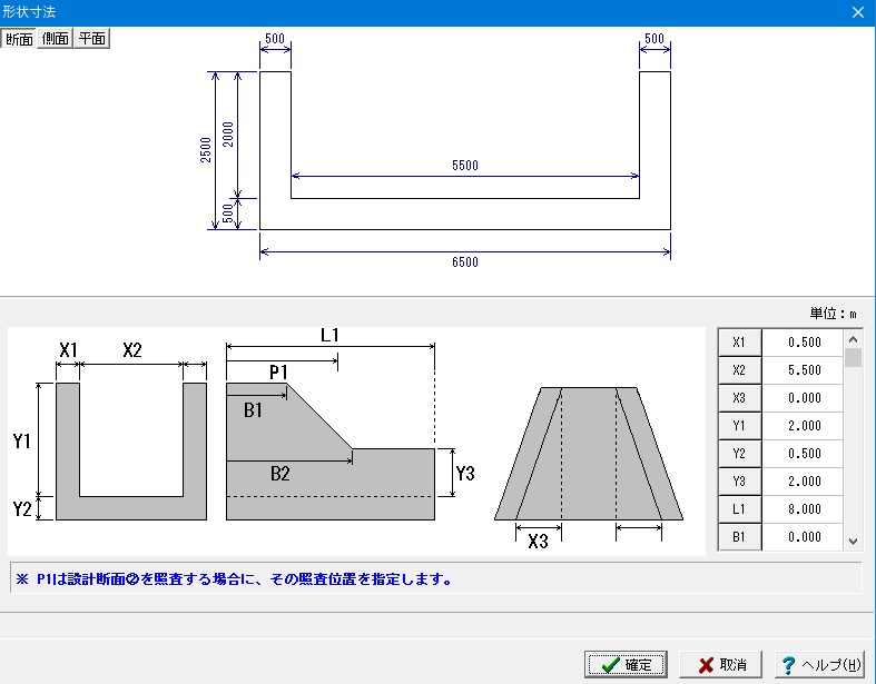 | 断面構造形式 | 矩形RC函体 矩形PC函体(1連、2連BOX) 円形函体(鋼管、RC巻立、コンクリート管、ダクタイル鋳鉄管、ヒューム管、高耐圧ポリエチレン管) 三面水路 門柱レス 2連函体の内空幅変化 翼壁を含んだモデル化にも対応 |