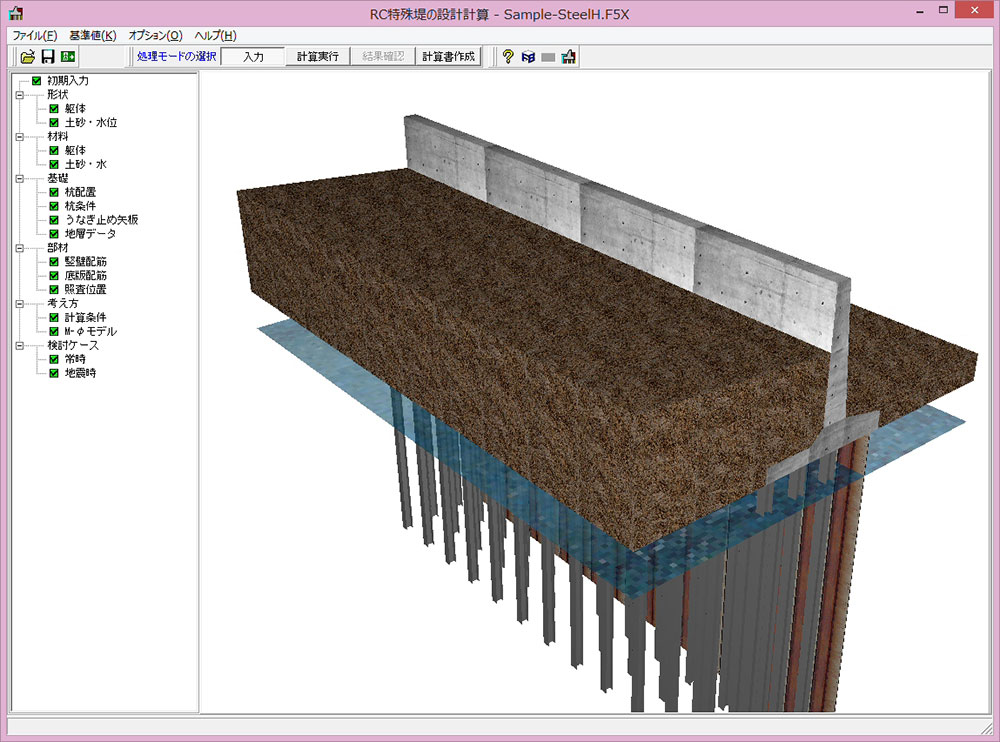 既設構造物についても耐震性能照査を可能とするため、古い構造物によく見られる H鋼杭の設計に対応しています。使用するH鋼材は従来のUC-1製品と同じように自由に登録することができます。また、河川構造物に設置されることの多い、" うなぎ止め"と呼ばれる遮水壁についても、一体でのモデル化が可能です。