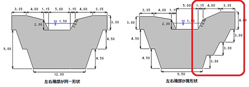 砂防堰堤の様々な設置箇所を想定すると、左右の袖部が同一となる形状は稀なケースかもしれませんが、袖部の形状を左右で別々に設定し、計算を一括した計算に対応しています。