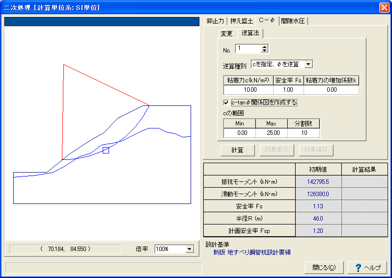 二次処理機能 必要抑止力の計算、押え盛土の計算、c-φ変更・逆算法