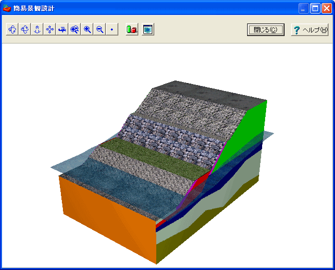 各種すべり面形状に対応し、常時・地震時・液状化時での解析が可能です。臨界面には最小安全率と最大抑止力とをサポートし、逆算法や間隙水圧の変更、格子範囲の変更等の二次処理機能に加え、圧密による地盤の強度増加やサンドコンパクションパイル工法、逆算法における鉛直層圧の計算、残留浸潤面の自動計算等の付加計算機能も豊富です。また、斜面安定解析で使用した標準断面形状に奥行きを与えることにより、すべり面の3D表示機能に加え、様々な法面対策工画像を貼り付けることによる三次元イメージパースを出力させる簡易景観設計を行うこともできます。