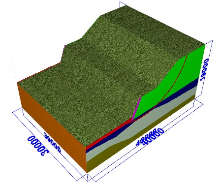 3D表示 すべり面表示 解析モデル形状に奥行きを与えた、地中のすべり面の3D表示、3Dアノテーション