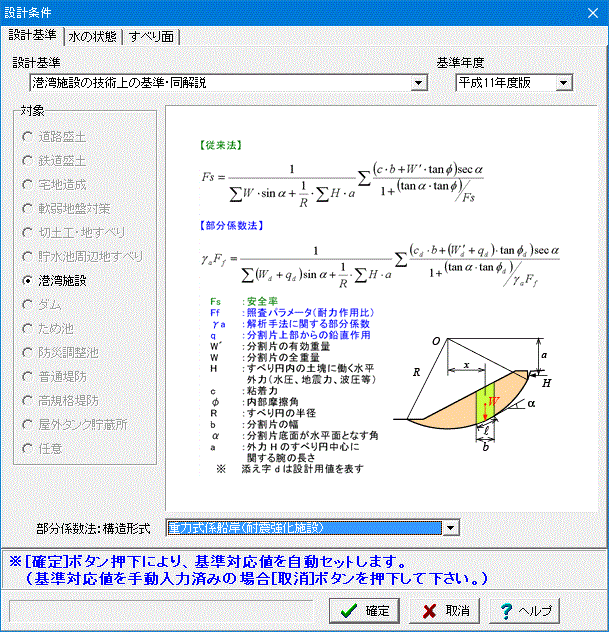 各種設計基準類の選択により対象とする土構造物における設定された湛水条件での土中水の状態を自動設定する斜面安定解析プログラムです。