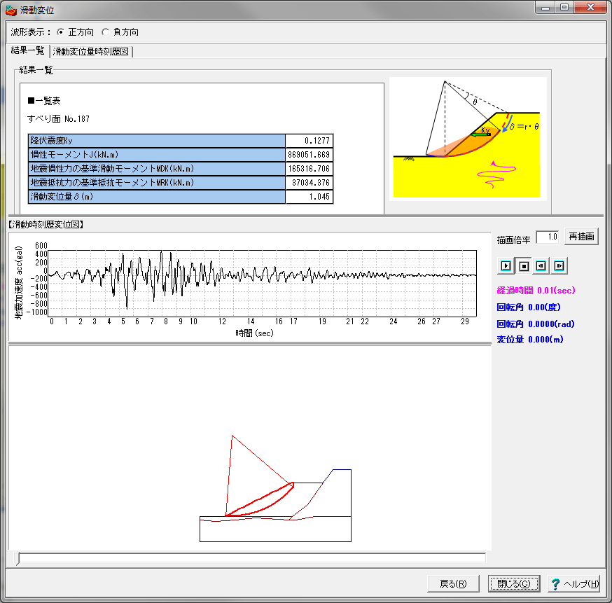 「ニューマーク法」では、従来の地震力を静的な慣性力とした破壊安全率による仕様設計に加え、地震波形を与えて地震後に残留する変位量に着目し、その大小による斜面の安定性性能評価が可能です。
