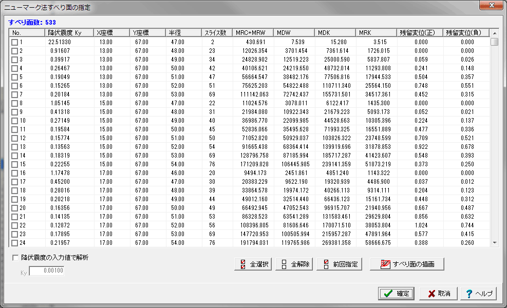 全すべり面及び諸元のリストビューワ出力・諸元によるすべり面のソート機能