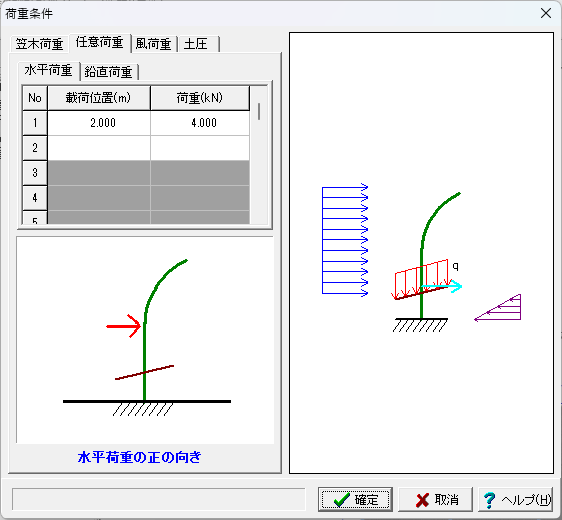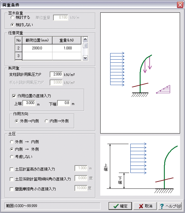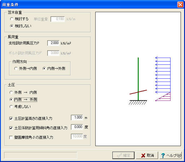 荷重条件画面で、土圧計算高さの直接入力(=1.000m)、土圧係数計算用傾斜角の直接入力(=0.0度)を入力することで、保護路肩部の土圧が考慮可能となります。