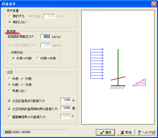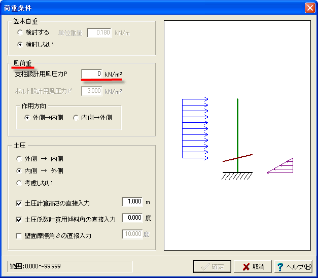 風荷重を作用させたくない場合は、風荷重強度を0kN/m2入力することが可能です。