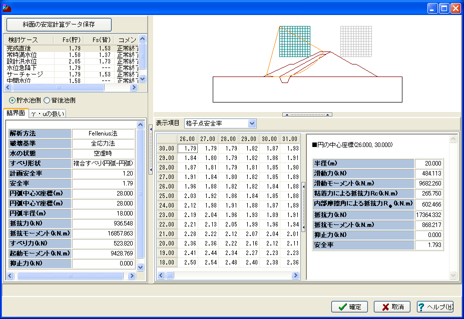 「土地改良事業設計指針 ため池整備」を主たる適用基準としており、ため池の設計計算を支援するプログラムです。堤体の安定計算(円弧すべり)を照査するために、水理計算を行い貯留効果の計算後に洪水吐きの計算を行うことで堤体の堤高、堤頂幅、水位高を自動的に設定することができます。