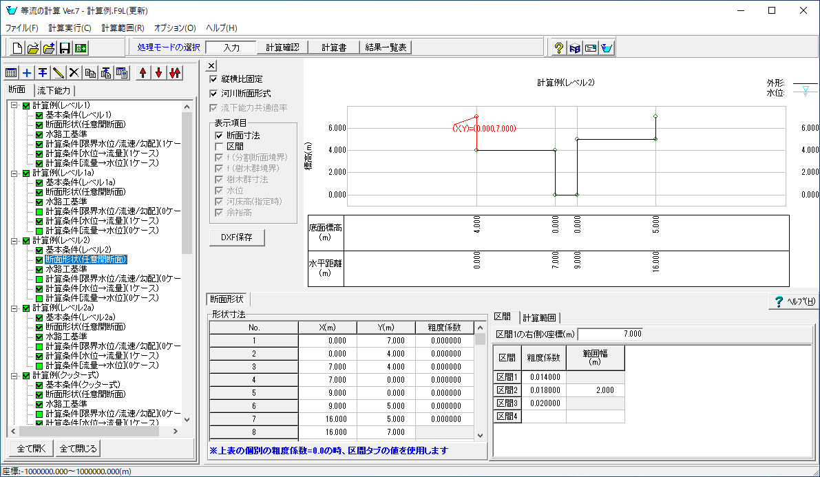 レベル2aは区間幅のみ定義します。(粗度係数はタブ「粗度係数」で入力します。)