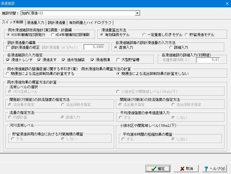 浸透施設においては、「雨水浸透施設の設備促進に関する手引き(案)」H22.4に記載している「雨水浸透効果の概算方法(簡便法) 流出抑制効果」について照査することができます。