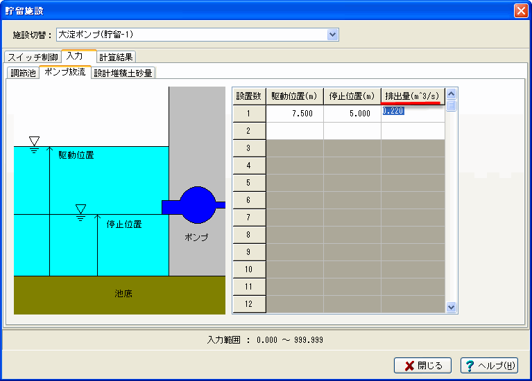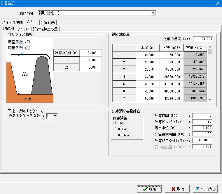 「貯留施設」入力画面-「入力」-「調節池」にて、調節池容量の水深と面積を直接入力いただけます。