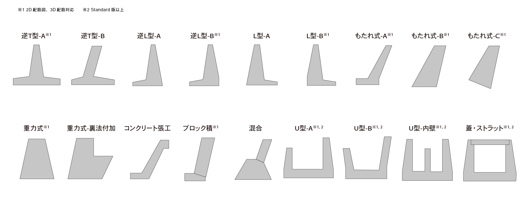 形状:逆T型(2種)、逆L型(2種)、L型(2種)、重力式(2種)、もたれ式(4種)、ブロック積、混合擁壁、任意形状