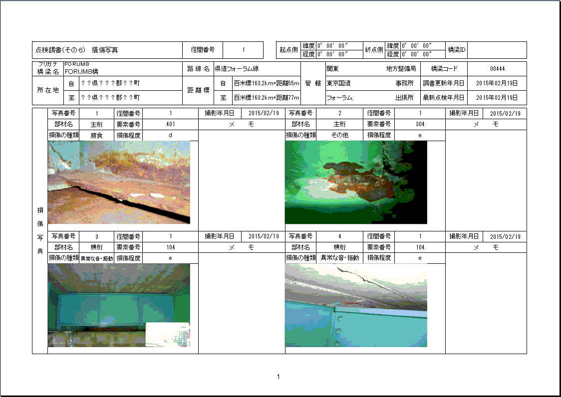 生成(読込み、追加、編集)した損傷情報は、「SXF,DXF, DWG、JWW, JWC」形式の損傷図面、および、「橋梁定期点検要領(平成26年6月版、平成31年3月版)」の点検調書として出力します。