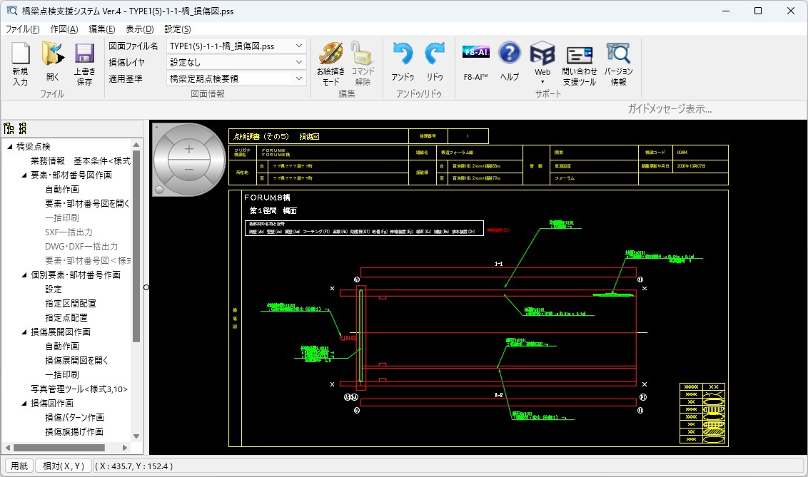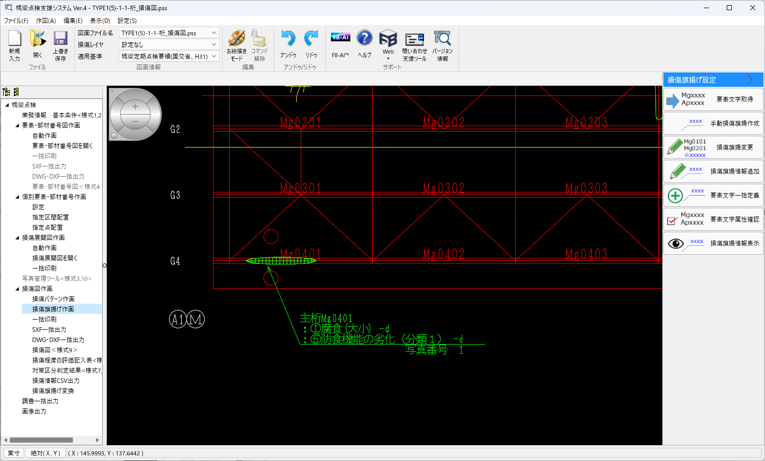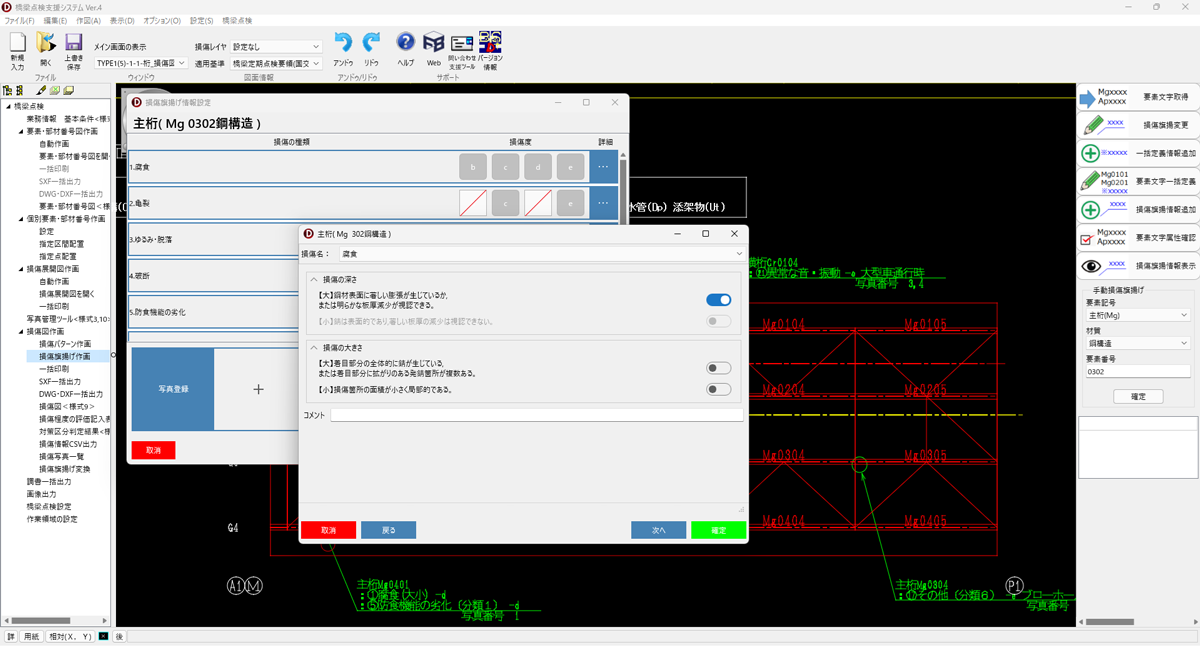 但し、点検調書(4)要素番号図及び部材番号図 部材番号(5)損傷図 は、2次元CAD図面として作成しますので、独自の形式のほか、DXF、GWG、SXFなどのCADファイルとして保存されます。