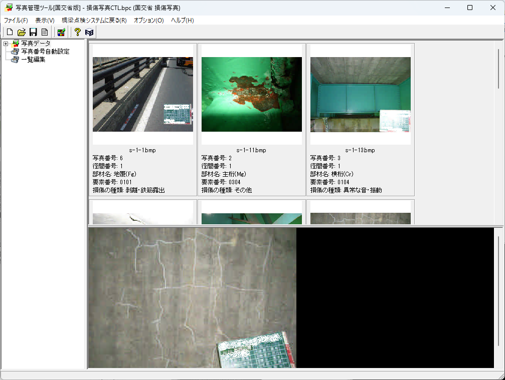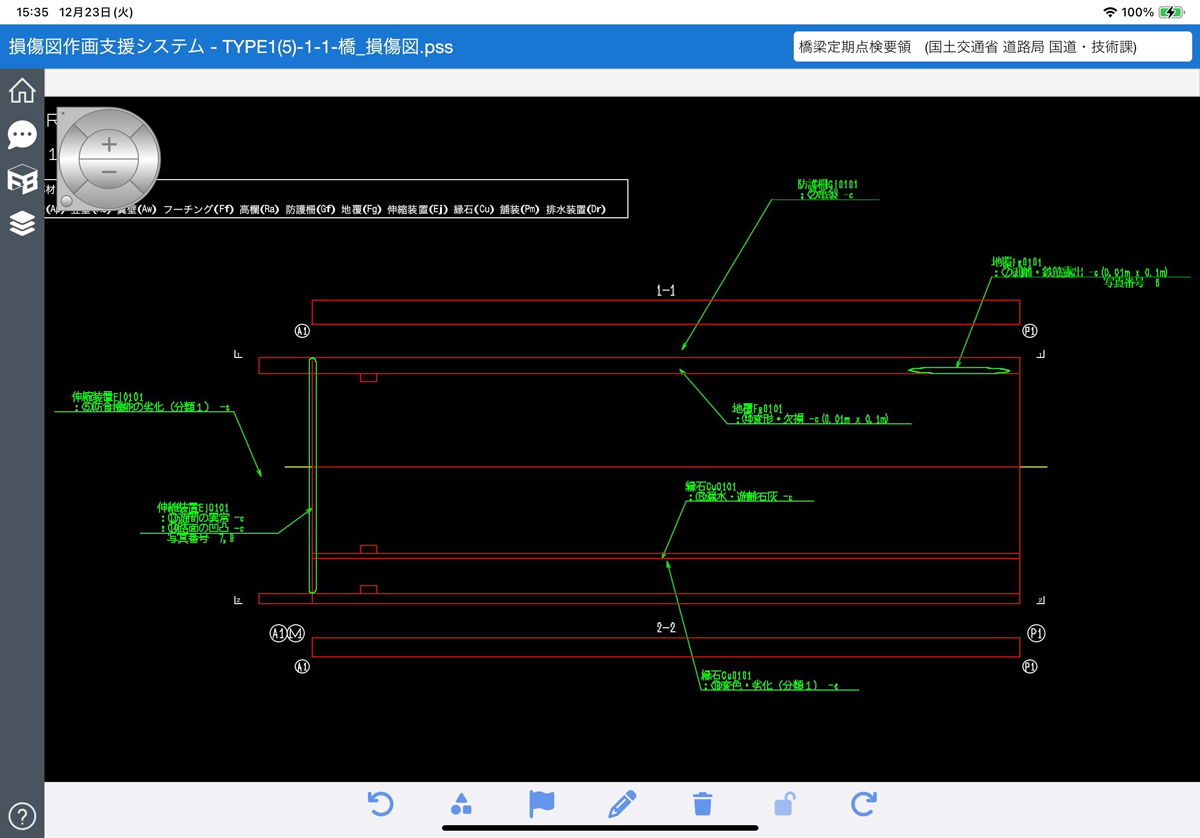 本システムではbmp、jpg、tiffなどの画像ファイルを読み込んで図面上に貼り付けることは、既に可能です。その上に、損傷情報を作画して行くことも可能です。いわゆるこの方法が手動で損傷図面を作成する方法ですが、自動作画で図面を作成したときには自動で設定される要素を管理するためのレイヤ分けが、手動での作図では、現在まだ出来ていません。この、手動作画として損傷図面を起動したとき、損傷要素のレイヤ作成機能を追加が実現すれば、画像の上に図形形状を作画し、ひび割れなぞって作画したり、旗揚げを作画して損傷図面の出力と損傷程度の評価記入表などの集計出力が可能となります。
