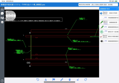 主として点検現場での利用が中心となるため、視認性の高い豊富な作画コマンドをバランスよく配置することで直感的に作業が行えるよう操作性を重視したデザインを採用しました。また、閉所作業場においてもストレスなくご利用いただけるよう、操作手順についてもオプティマイズを施し作業の効率化・省力化の実現を図りました。
