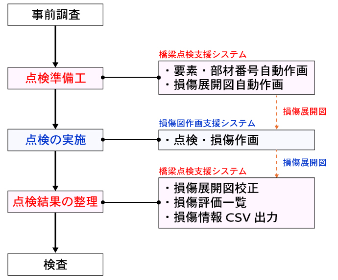 生成(読込み、追加、編集)した損傷情報は、「SXF,DXF, DWG、JWW, JWC」形式の損傷図面、および、「橋梁定期点検要領(平成26年6月版、平成31年3月版)」の点検調書として出力します。