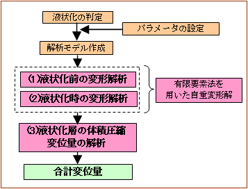 については考慮されないため、液状化層の体積圧縮に伴う沈下量を別途算定し、合算することで、堤防全体の変位量を求めます。