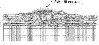 計算事例-01 : 液状化時天端沈下量163.0cm + 体積圧縮38.3cm = 201.3cm