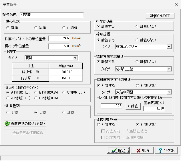 - 2.入力データ、基本条件出力において、落橋防止構造の種類や震度データを追加