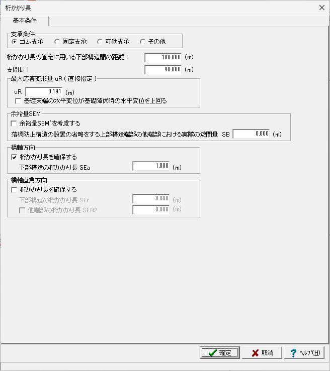 「桁かかり長」画面の「基本条件」タブにおいて、方向ごとに照査の有無を設定できます。