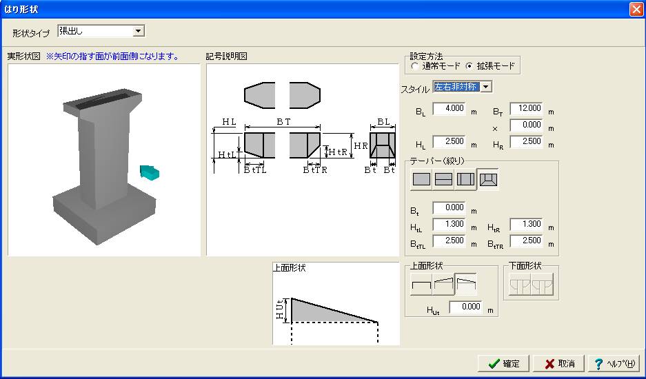 | はり形状 | ・はり(柱の上にはりがのる)形式(矩形、小判形)、張り出し(柱の側面にはりがつく)形式の設計が可能です(後者の場合は、はり先端をしぼる形状も設計可能です)。 |