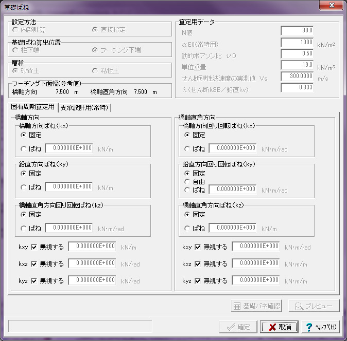 | 基礎形式 | 直接基礎、杭基礎、深礎基礎、その他 なお、基礎形式は、計算書への表示および基礎ばね入力方法(直接基礎は内部計算、その他の形式は直接指定)の決定のみに使用します。 |