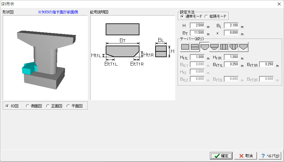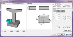 | はり形状 | はり(柱の上にはりがのる)形式(矩形、小判形)、張り出し(柱の側面にはりがつく)形式の設定が可能(後者の場合は、はり先端をしぼる形状も設定可能です) |