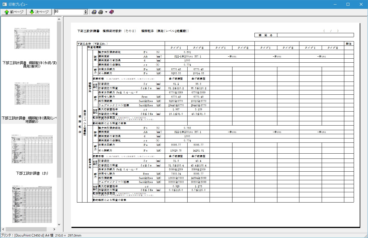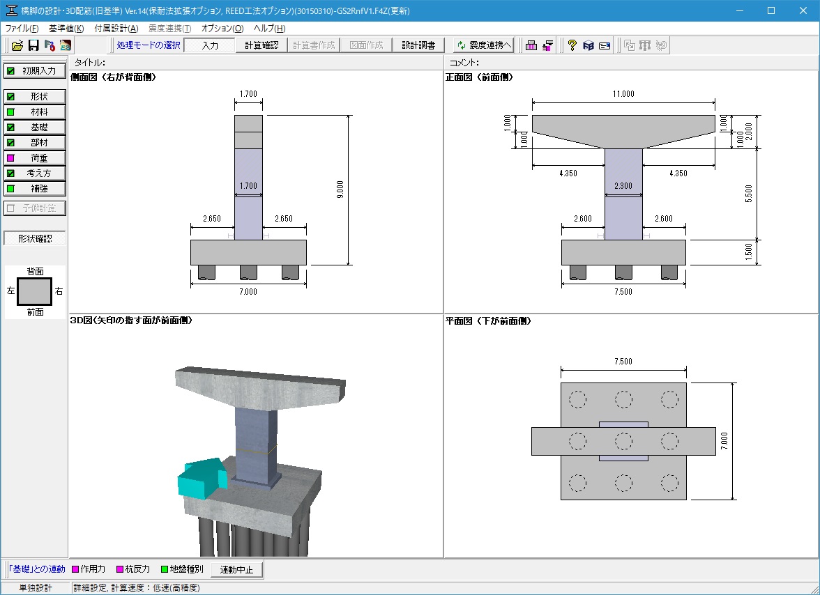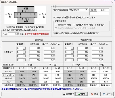 | 基礎形式 | 直接基礎、杭基礎、ケーソン基礎、鋼管矢板基礎、深礎基礎 (杭基礎、ケーソン基礎、鋼管矢板基礎は「基礎の設計」、深礎基礎は「深礎フレームの設計」が必要) また、基礎連動用XMLファイルを介して「基礎の設計」に基礎検討用データを渡すことにより、地中連続壁基礎の検討が可能。 |