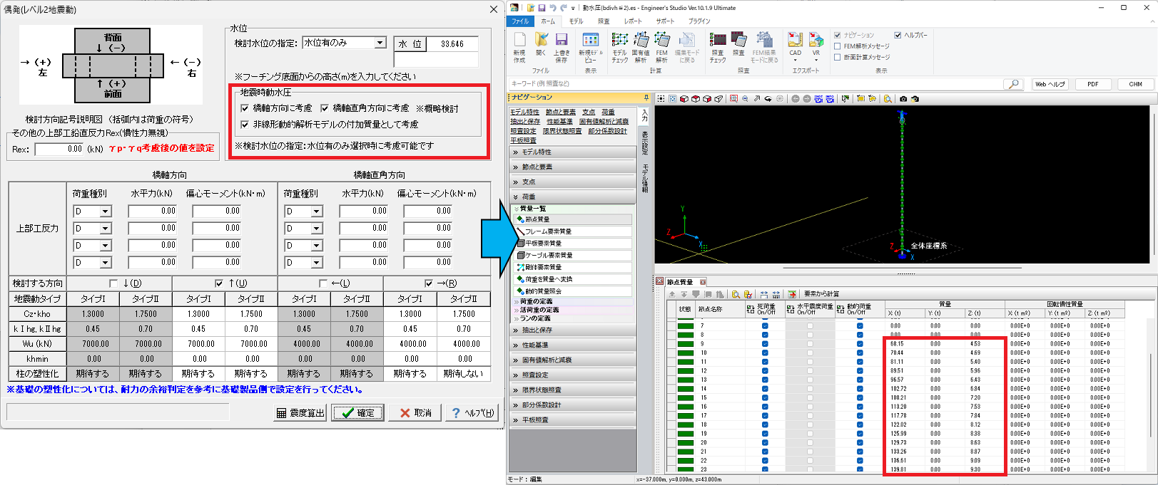 検討方向ごとに地震時動水圧を考慮でき、非線形動的解析モデルエクスポート時には、下図のように地震時動水圧作用区間への節点質量としてモデル化します。