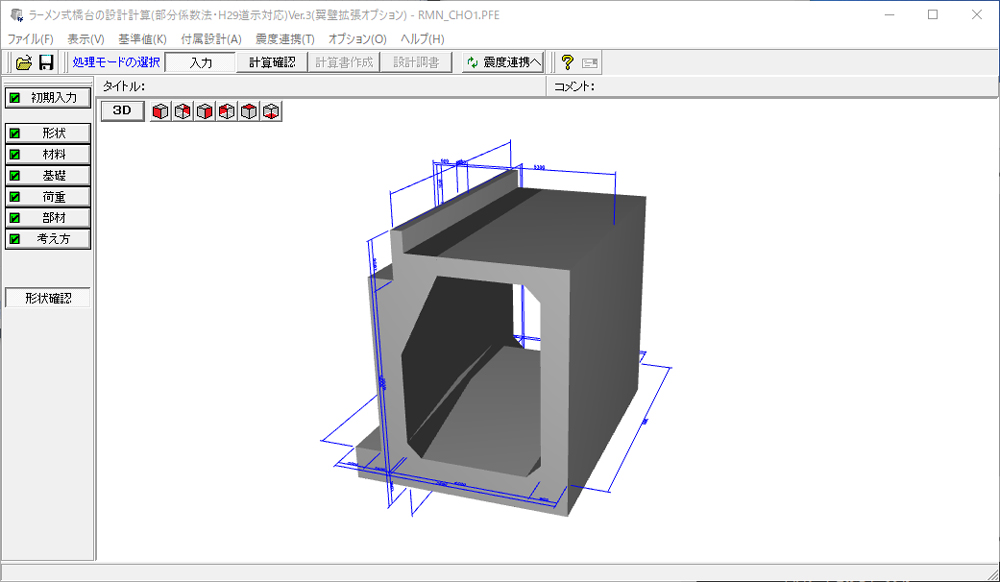 公益社団法人 日本道路協会より平成29年11月に発刊された道路橋示方書・同解説に基づき、形状より骨組モデルを作成して作用荷重を与えることで自動的に骨組解析を行って、不静定構造物であるラーメン式橋台の設計計算を行うプログラムです。