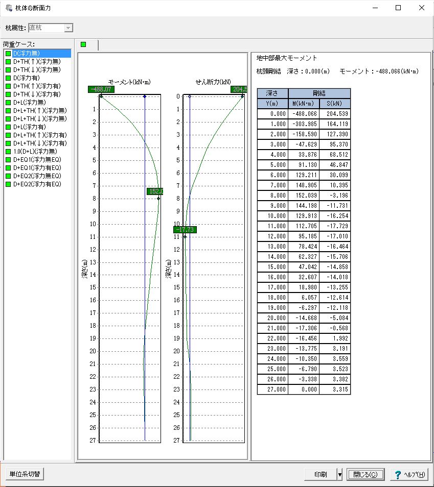 但し、骨組解析時は全体の釣り合いを保つため、杭頭の水平反力・モーメントを考慮し断面照査を行います。