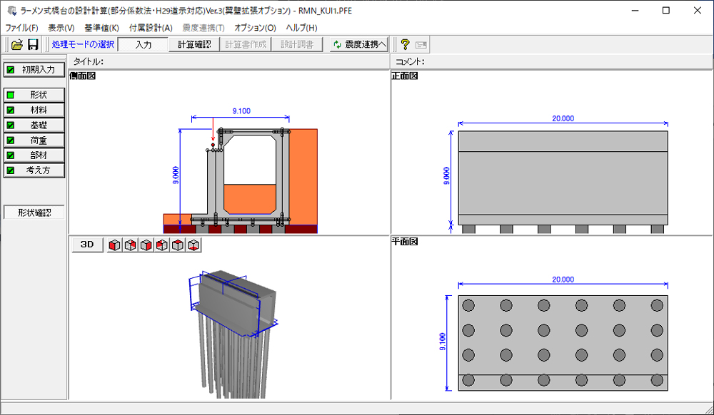 主に道示IV、V(H24.3)、設計要領(H18.4)に基づき、形状より骨組モデルを作成して作用荷重を与えることで自動的に骨組解析を行って、不静定構造物であるラーメン式橋台の設計計算を行うプログラムです。橋座の設計の対応、踏掛版・突起の考慮、翼壁の設計、フーチング補強(増し杭工法)、杭本体の設計などをサポートします。