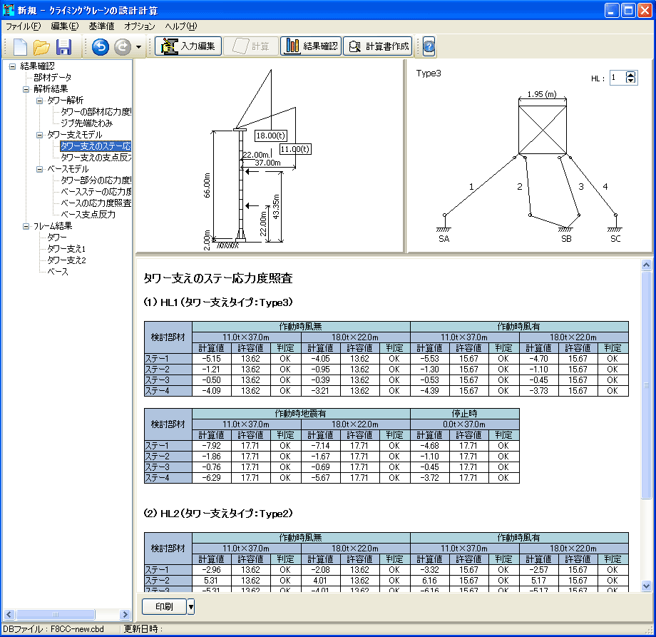 応力照査を行う部位は、タワー、タワー支え、ベース、ベースステーです。ジブ(ブーム)、旋回体などは、荷重としてタワー天端に作用させます。