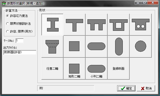 限界状態設計法の照査は、矩形(ハンチなし・中空部なし)、円形・円環、I形、T形、箱形(1室、ハンチなし)に限定されます。また、鉄筋以外の材料及び、ねじりに対する疲労限界状態の照査は行なっていません。