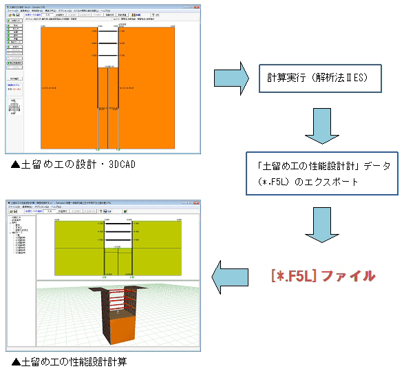 ▲「土留め工の設計・3DCAD」から「土留め工の性能設計計算」データ(*.F5L)のエクスポート