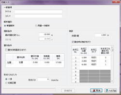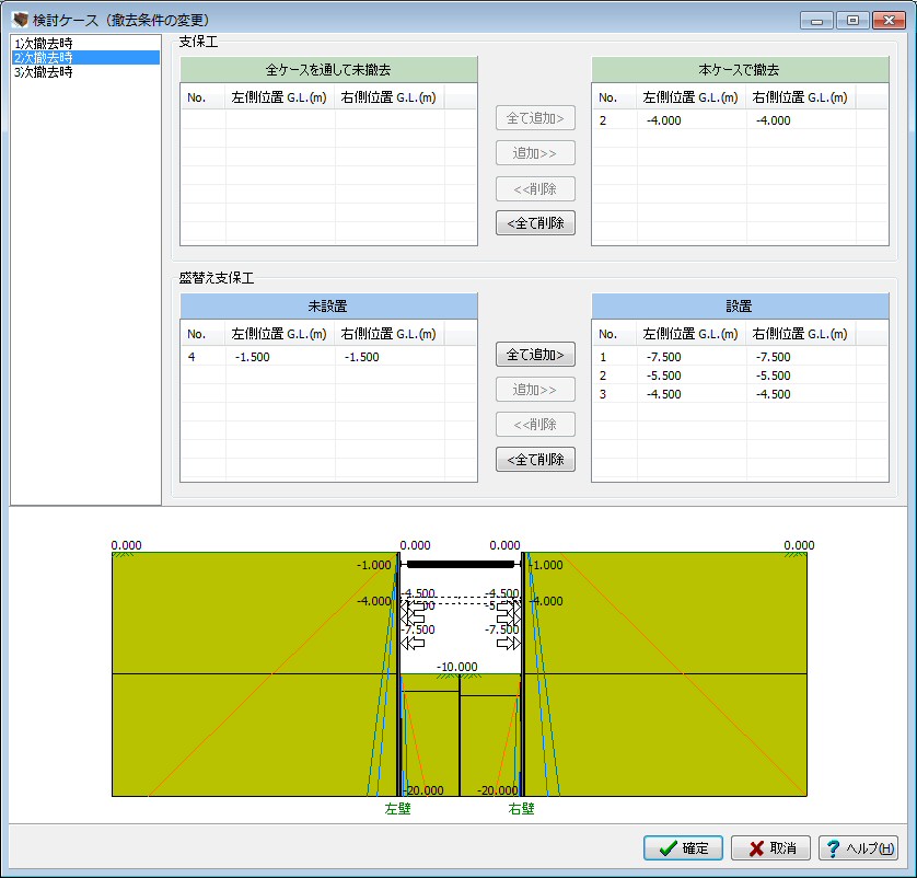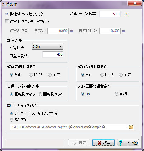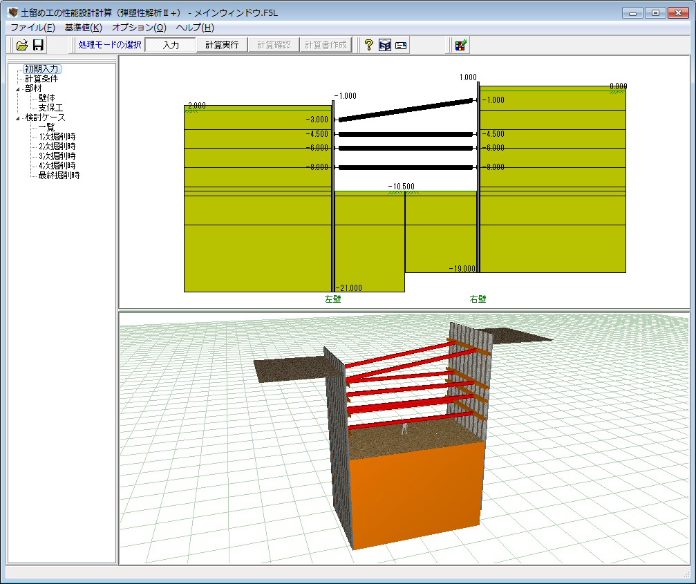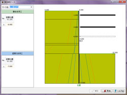 | 制限事項 | 支保工段数:最大20段 検討ケース数:最大41ケース(掘削時:21、撤去時20) 盛替え支保工段数:最大20段 壁体断面変化数:最大10断面 形状バネの区間数:最大20区間 側圧の入力層数:最大20層 |