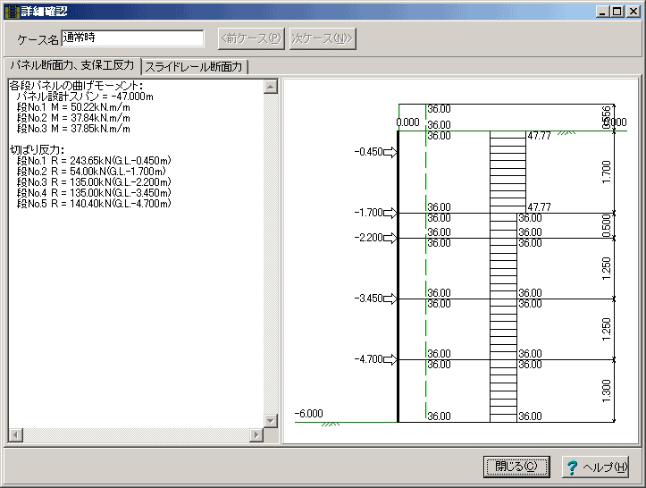 標準区間(通常の設計時)、並びに、長尺管吊り下し区間(腹起し、切ばり)の検討時に対応。後者は、スライドレール(縦梁)部の切ばりを飛ばずためH形鋼を腹起しとして使用。パネル(プレート)の受ける荷重は中間部のスライドレールを介して腹起しに伝達され、両端のスライドレールに設ける切梁に軸力が作用するものと考えて設計します。中間部スライドレールの検討方法は、支点となる切梁に相当するものが腹起しであると考える以外は標準区間の設計方法と同じであると考えます。本区間を指定した場合は、捨ばり施工時の検討は行えません。