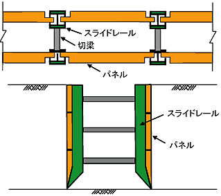 2本以上の切ばりをスライドレールに取り付け梯子状にしたものを2組組み立てます。あらかじめ掘削した溝にこれらを設置し、次にパネル2枚を左右のスライドレールにはめ込み、箱状になった内側を掘削しパネル、スライドレールの順に押し込み、この作業を繰り返して所定の深さに沈設する工法です。